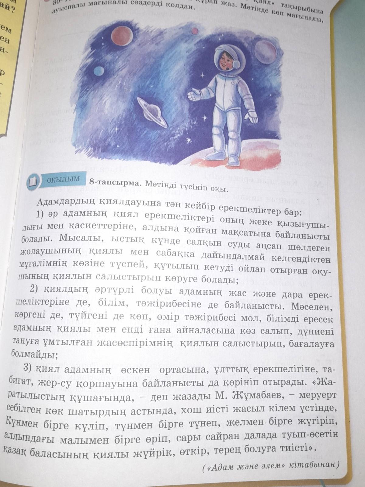 ЖАЗЫЛЫМ 9-тапсырма. Мәтін мазмұны бойынша жоспар құрып жаз. Ол үшін мәтіндегі әр бөлікке тақырып қой. Тақырыптың тұсына сол бөліктің ішіндегі тірек сөздерді жаз. Тірек сөздердің үндестік заңына сәйкес айты лу ерекшелігін түсіндір.пж помогите сделаю ваш ответ лучшим