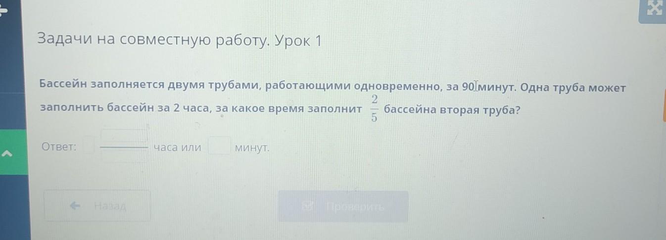 Задачи на совместную работу. Урок 1 Бассейн заполняется двумя трубами, работающими одновременно, за 90 минут. Одна труба может 2 заполнить бассейн за 2 часа, за какое время заполнит бассейна вторая труба? 5 Сл Ответ: часа или минут. - Назад Проверить