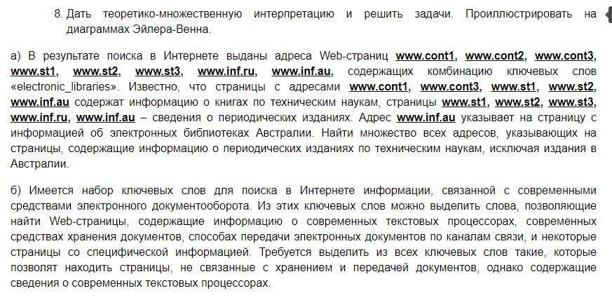 В результате поиска в Интернете выданы адреса Web-страниц www.cont1, www.cont2, www.cont3, www.st1, www.st2, www.st3, www.inf.ru, www.inf.au, содержащих комбинацию ключевых слов «electronic_libraries». Известно, что страницы с адресами www.cont1, www.cont3, www.st1, www.st2, www.inf.au содержат информацию о книгах по техническим наукам, страницы www.st1, www.st2, www.st3, www.inf.ru, www.inf.au – сведения о периодических изданиях. Адрес www.inf.au указывает на страницу с информацией об электронных библиотеках Австралии. Найти множество всех адресов, указывающих на страницы, содержащие информацию о периодических изданиях по техническим наукам, исключая издания в Австралии.