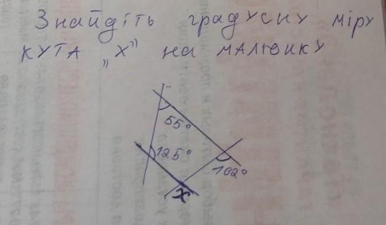 оскільки,це чотири кутник то сума його кутів = 360°,тоді кут біля х буде = 180-(55+125+78)=102