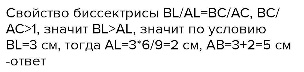 5. CL - бісектриса трикутника ABC. AC = 6 см, ВС = 9 см. = Більший з відрізків, на які бісектриса си ділить сторону АВ, дорівнює 3 см. Знайдіть AB. А. 7,5 см Б. 6 см В. 5 см Г. 6,5 см