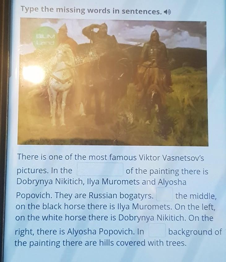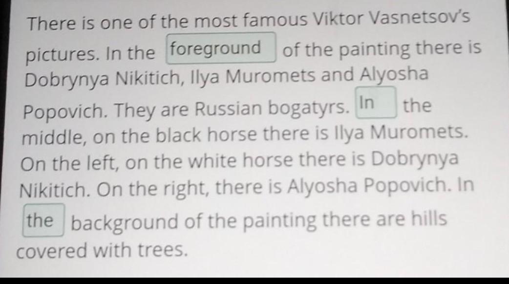 Type the missing words in sentences. There is one of the most famous Viktor Vasnetsov's pictures. In the ... of the painting there is Dobrynya Nikitich, Ilya Muromets and Alyosha Popovich. They are Russian bogatyrs. ... the middle, on the black horse there is llya Muromets. On the left, on the white horse there is Dobrynya Nikitich. On the right, there is Alyosha Popovich. In ... background of the painting there are hills covered with trees.