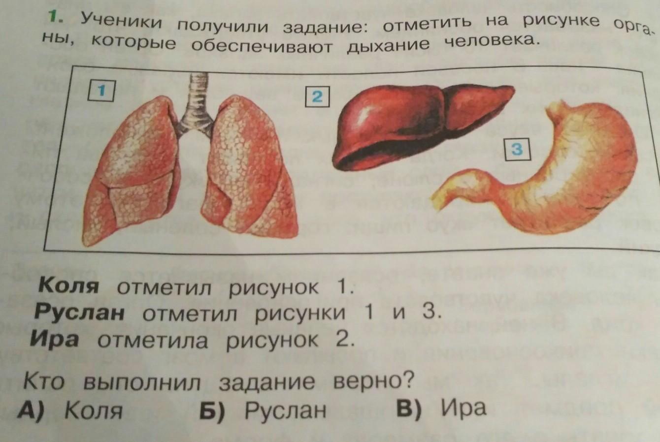 1. Ученики получили задание: отметить на рисунке орга- ны, которые обеспечивают дыхание человека. Коля отметил рисунок 1. Руслан отметил рисунки 1 и 3 Ира отметила рисунок 2 Кто выполнил задание верно? A) Коля Б) Руслан B) Ира