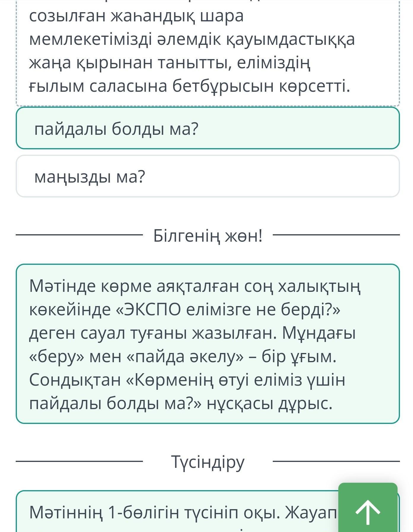 1. 2017 жыл еліміз үшін маңызды еді, себебі сол жылы Қазақстанда ЭКСПО халықаралық көрмесі өтті. Көрме аяқталған соң бәрімізде «ЭКСПО елімізге не берді?» деген сауал туындады.