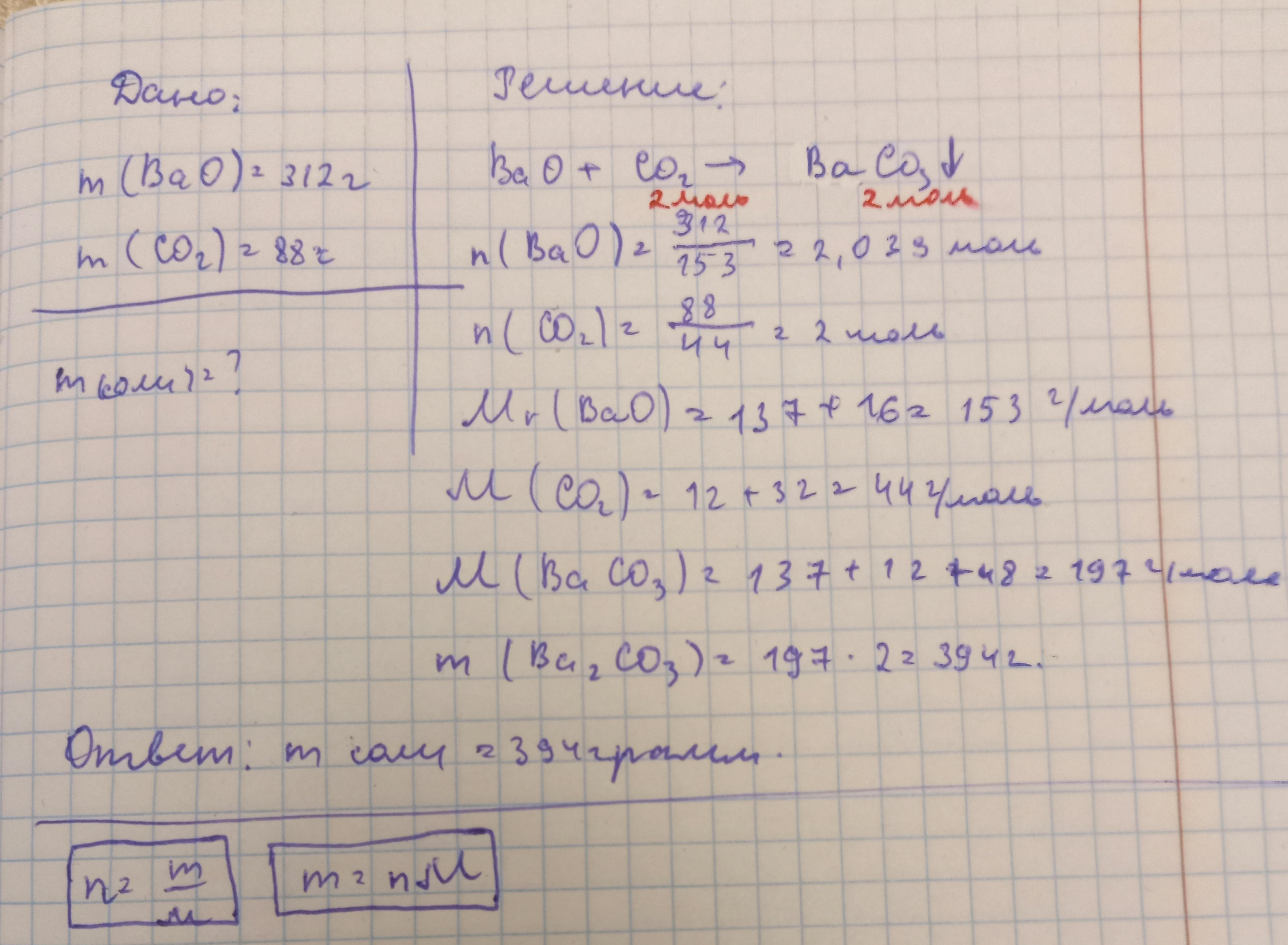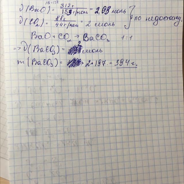 По реакции молям, что BaO взяли больше, чем нужно для реакии. Решаем задачу через CO2, т.к. он весь вступил реакцию и переносим моли на BaCO3