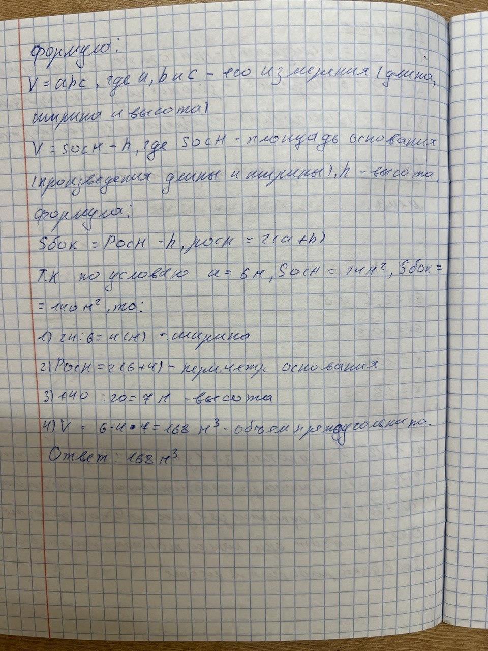 290. Найдите объём прямоугольного параллелепипеда, у которого длина a=6м, площадь основания равна 24 м², площадь боковой поверхности - 140 м².
