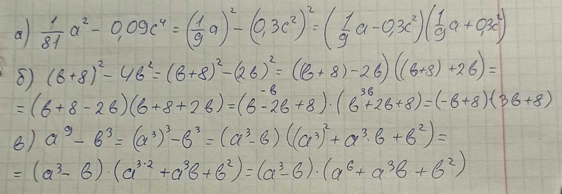 Пояснення: В первой и второй задаче применили формулу "разность квадратов", а в третьей - "разность кубов".