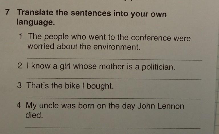 1.Люди, пришедшие на конференцию, беспокоились об окружающей среде. 2.Я знаю девушку, мать которой политик.3.Это велосипед, который я купил. 4.Мой дядя родился в день смерти Джона Леннона.