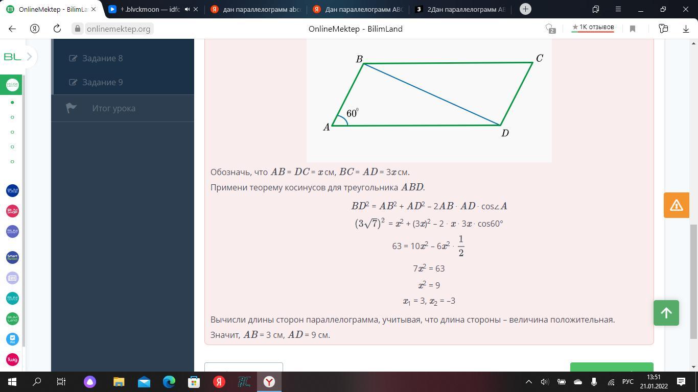 2Дан параллелограмм ABCD. BC : AB = 3, BD = см, ∠ = 60°. Найди длины сторон параллелограмма. ответы: 4,3,9,12,6,2