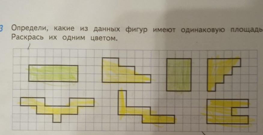 Определи, какие из данных фигур имеют одинаковую площадь. Раскрась их одним цветом. т