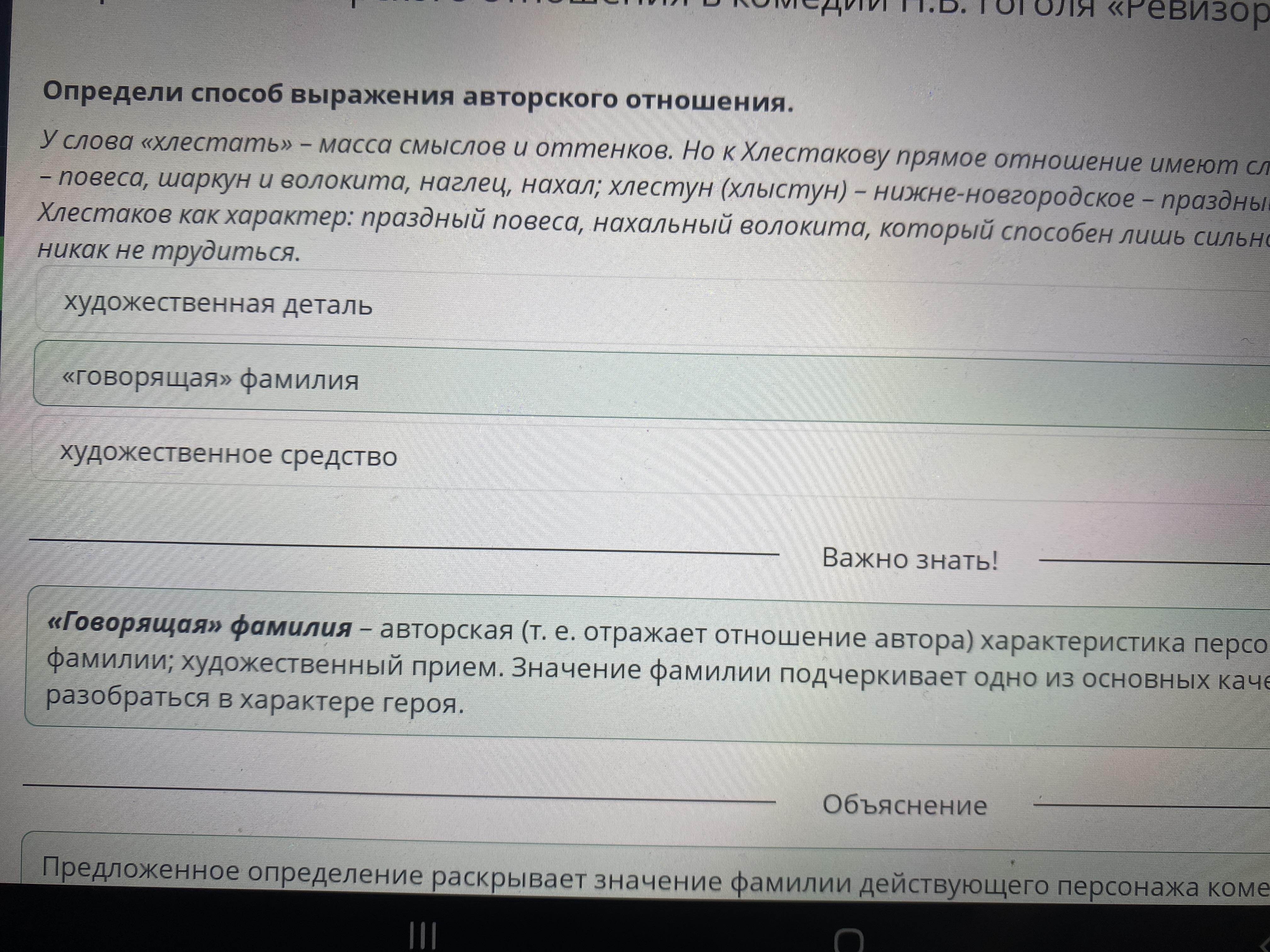 Определи способ выражения авторского отношения. услова «хлестать» - масса смыслов и оттенков. но к хлестакову прямое отношение имеют следующие: врать, пустословить; хлеско - повеса, шаркун и волокита, наглец, нахал; хлестун (хлыстун) - нижне-новгородское - праздный шатун, тунеядец. в фамилии - весь хлестаков как характер: праздный повеса, нахальный волокита, который способен лишь сильно, бойко врать и пустословить, но никак не трудиться. художественное средство художественная деталь «говорящая» фамили пжпжпжпж как срочно