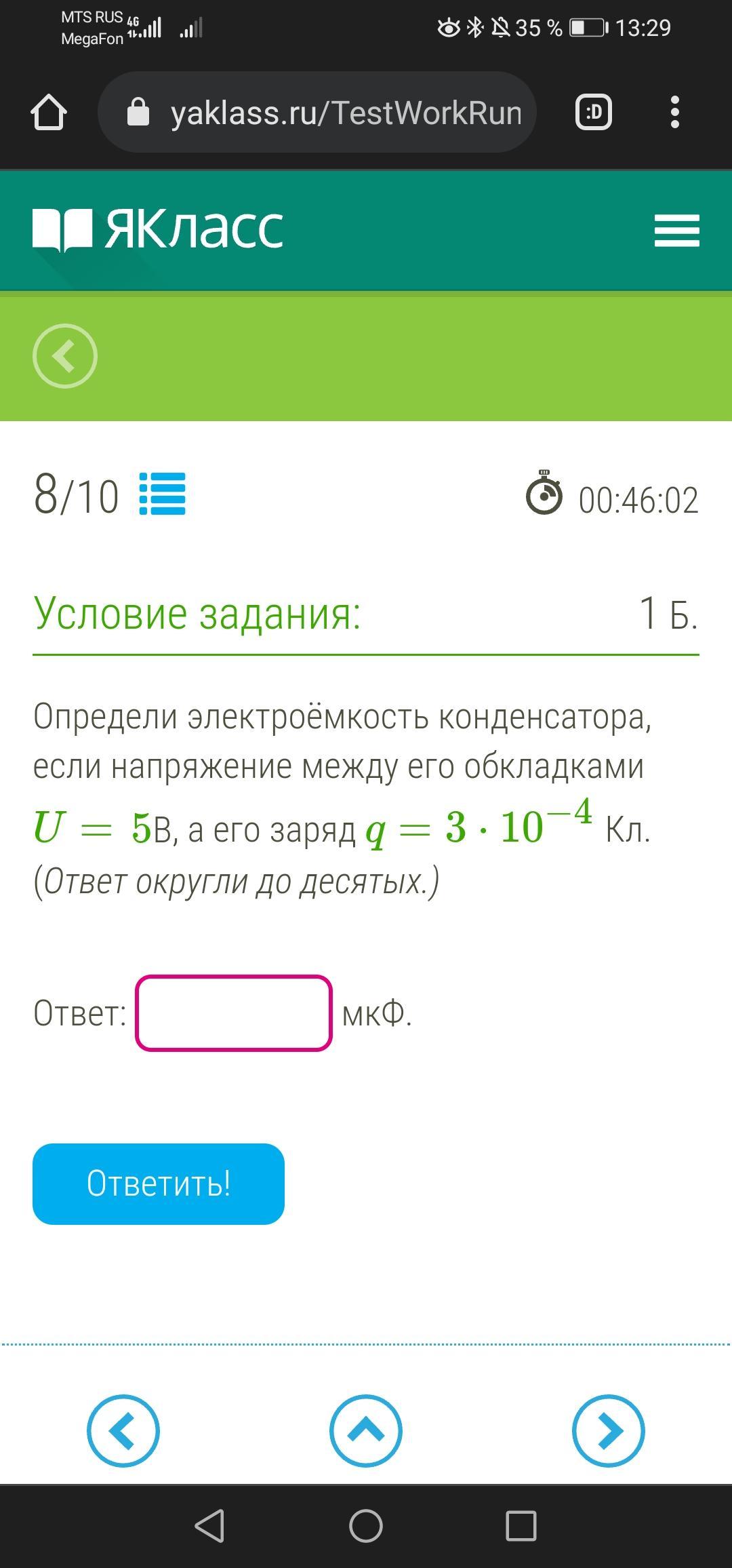 Определи электроёмкость конденсатора, если напряжение между его обкладками U = 5 В, а его заряд q = 3•10^-4 Кл.