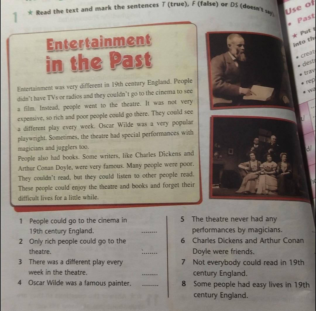 Entertainment in the Past Entertainment was very different in 19th century England. People didn't have TVs or radios and they couldn't go to the cinema to see a film. Instead, people went to the theatre. It was not very expensive, so rich and poor people could go there. They could sec a different play every week. Oscar Wilde was a very popular 1. playwright. Sometimes, the theatre had special performances with People also had books. Some writers, like Charles Dickens and Arthur Conan Doyle, were very famous. Many people were poor. They couldn't read, but they could listen to тother people read. These people could enjoy the theatre and books and forget their difficult lives for a little while. 1 People could go to the cinema in 19th century England. 2 Only rich people could go to the 5 The theatre never had any performances by magicians. 6 Charles Dickens and Arthur Cona mple theatre. Doyle were friends. 7 Not everybody could read in 19th century England. 8 Some people had easy lives in 19rsbu century England. 3 There was a different play every week in the theatre. 4 Oscar Wilde was famous painter. Ravla