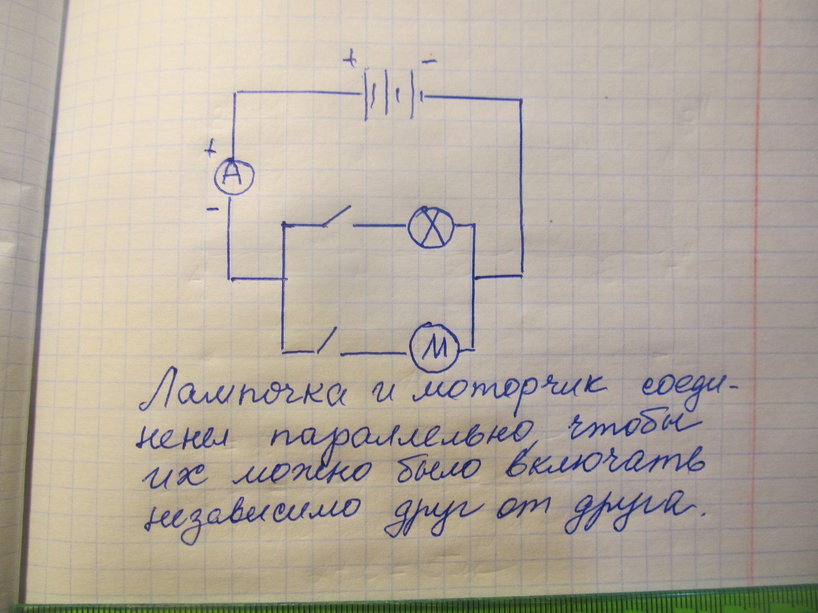 Цепь состоит из источника тока, батареи из 3 гальванических элементов, двух потребителей: лампочки и моторчика, двух ключей и амперметра, измеряющего силу тока во всей цепи.