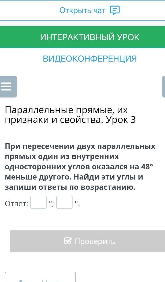 При пересечении двух параллельных прямых один из внутренних односторонних углов оказался на 48° меньше другого. Найди эти углы и запиши ответы по возрастанию.