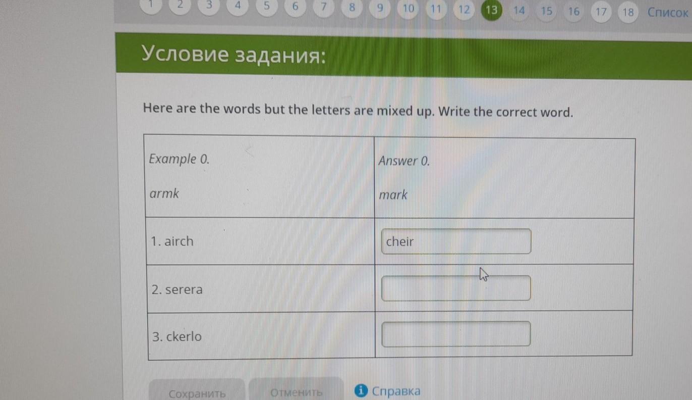 Here are the words but the letters are mixed up. Write the correct word. serera;cheklo