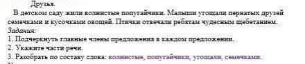 малыши(сущ) угощяли(глаг) пернатых(прил) друзей(сущ) семечками(сущ) и(союз) кусочками(сущ) овощей(сущ) . подлежащие-малыши, сказуемое-угощяли