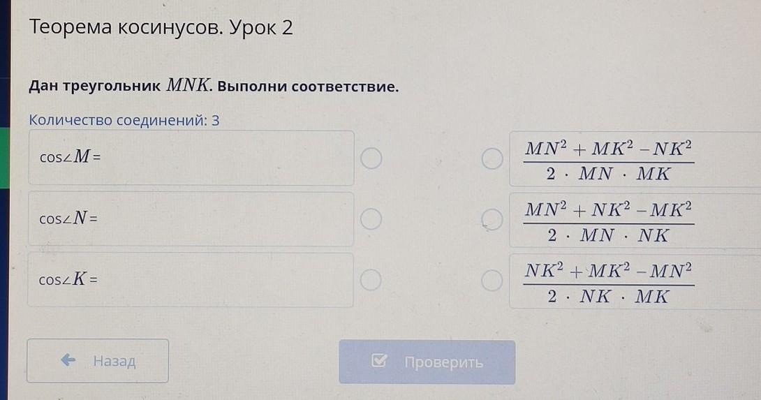 Теорема Косинусов.Урок2 Дан треугольник MNK.выполни соответствие (см.фото)