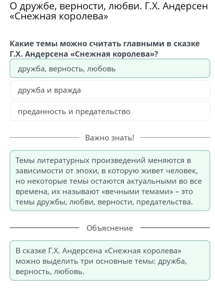= х О дружбе, верности, любви. Г.Х. Андерсен «Снежная королева» Какие темы можно считать главными в сказке Г.Х. Андерсена «Снежная королева»? преданность и предательство дружба и вражда дружба, верность, любовь помогите пожалуйста срочно