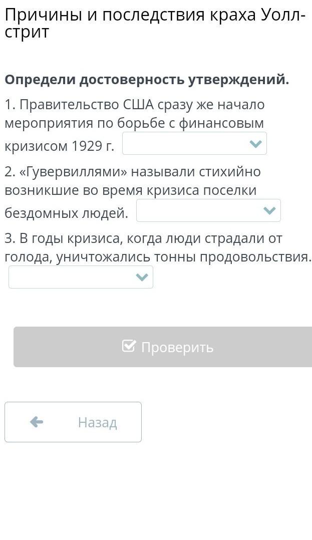 Причины и последствия краха Уолл-стрит Определи достоверность утверждений. 1. Правительство США сразу же начало мероприятия по борьбе с финансовым кризисом 1929 г. 2. «Гувервиллями» называли стихийно возникшие во время кризиса поселки бездомных людей. 3. В годы кризиса, когда люди страдали от голода, уничтожались тонны продовольствия. Назад Проверить