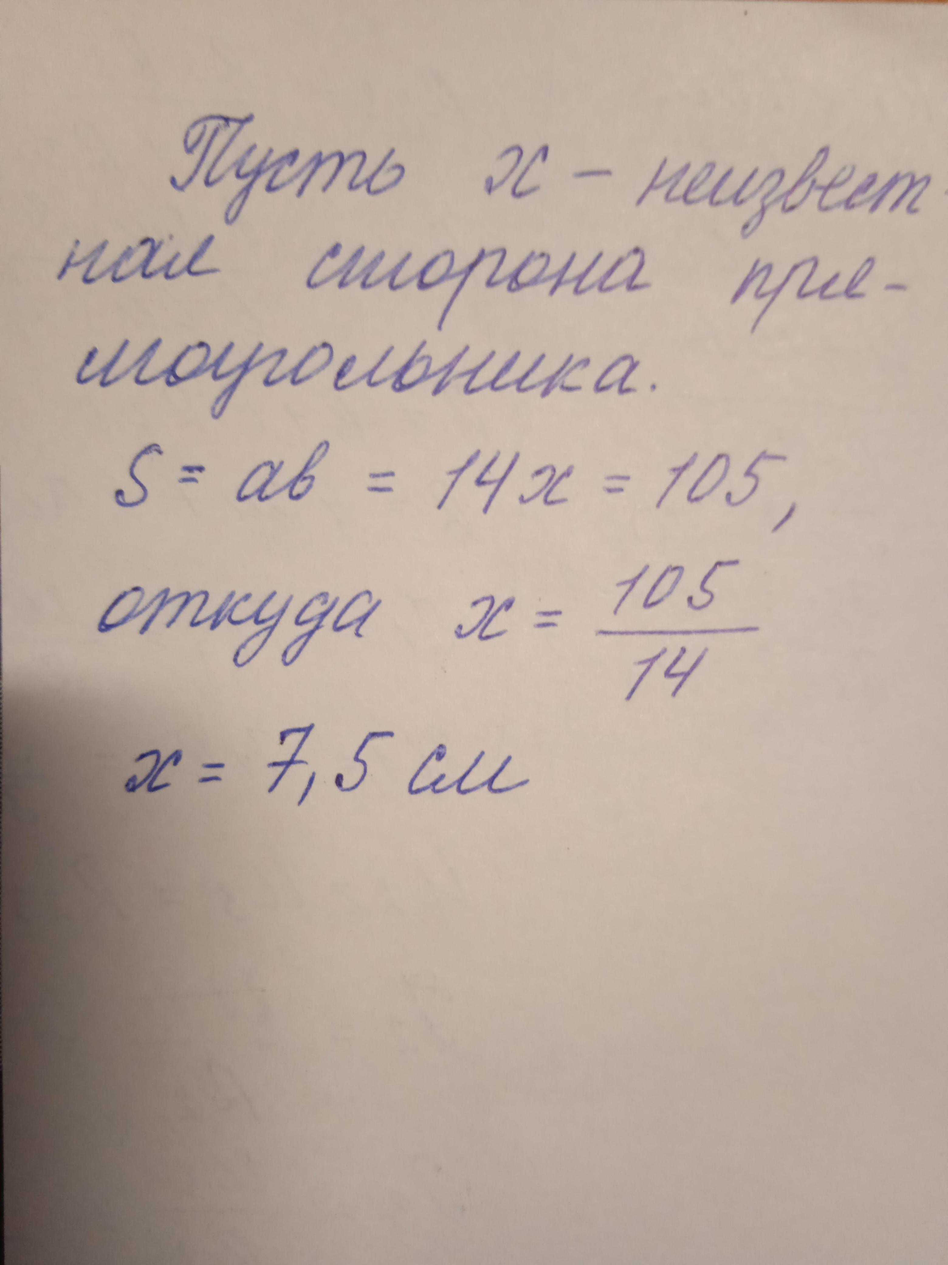 Одна сторона прямоугольника равна 14 см, а его площадь 105 . Найдите вторую сторону прямоугольника.