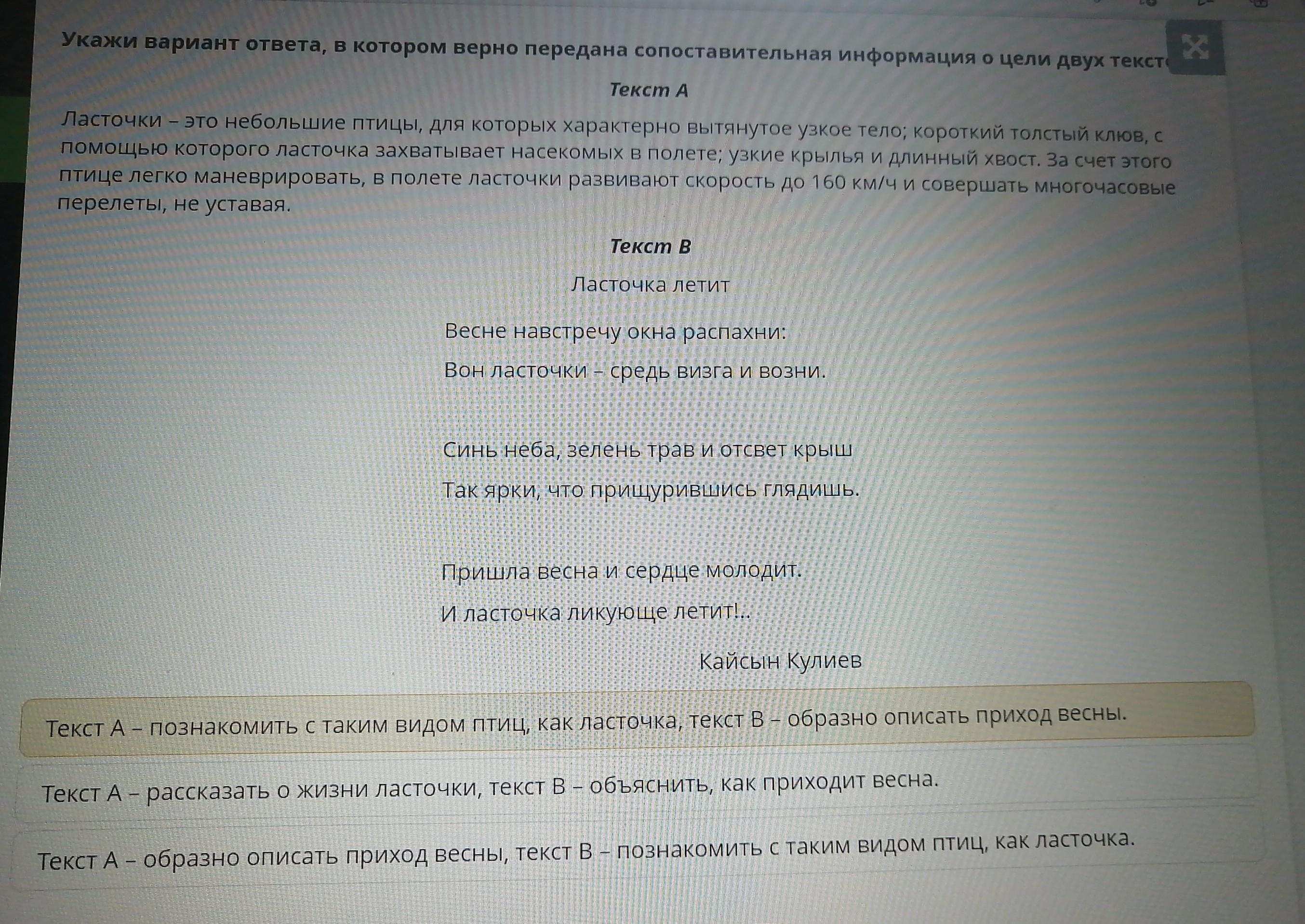 1 вариант, текст А описывает ласточек, знакомит с этим видом птиц.
