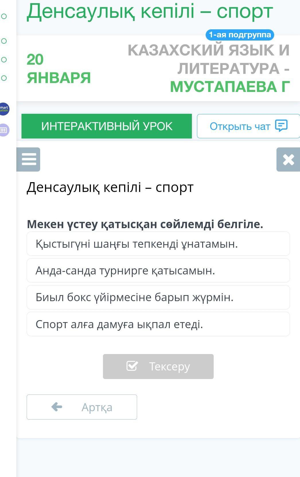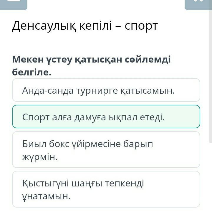 Денсаулық кепілі – спорт Мекен үстеу қатысқан сөйлемді белгіле. Қыстыгүні шаңғы тепкенді ұнатамын. Анда-санда турнирге қатысамын. Биыл бокс үйірмесіне барып жүрмін. Спорт алға дамуға ықпал етеді. Артқа Тексеру