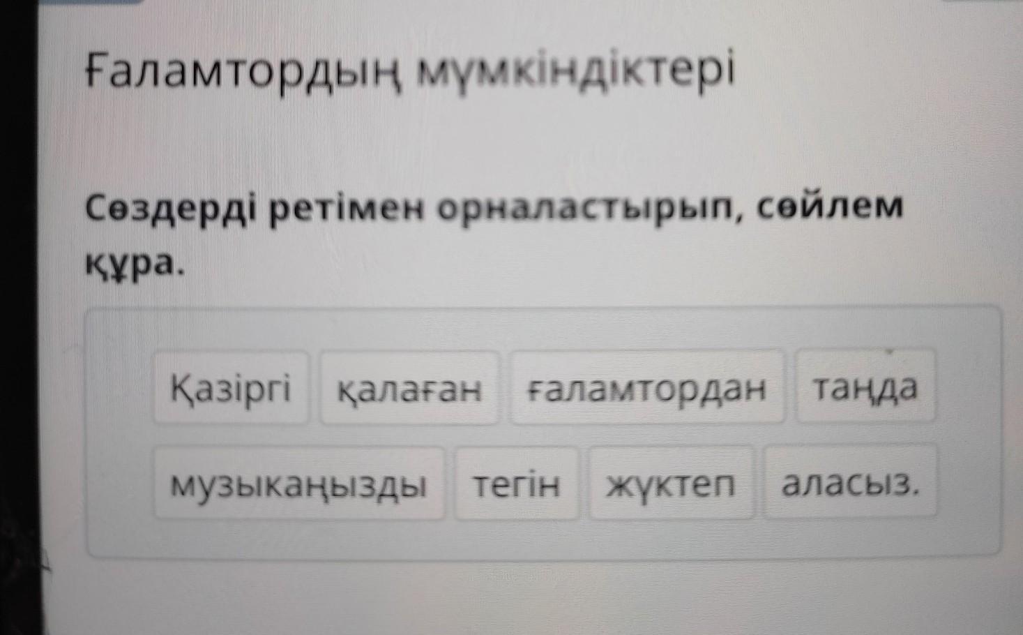 Сөздерді ретімен орналастырып, сөйлем құра. Қазіргі қалаған ғаламтордан таңда аласыз. музыкаңызды тегін жүктел