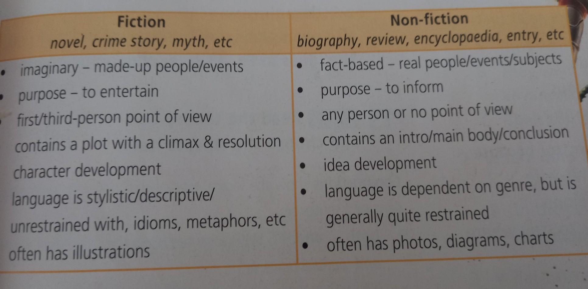 Ответ:imaginary – made-up events • purpose – to entertain • first person point of view • contains a plot with a climax & resolution character development • language is stylistic with, idioms, metaphors, etc • often has illustrations •fact-based - real events purpose - to inform any person or no point of view contains an main body idea development language is dependent on genre, but is generally quite restrained often has photos, diagrams, charts
