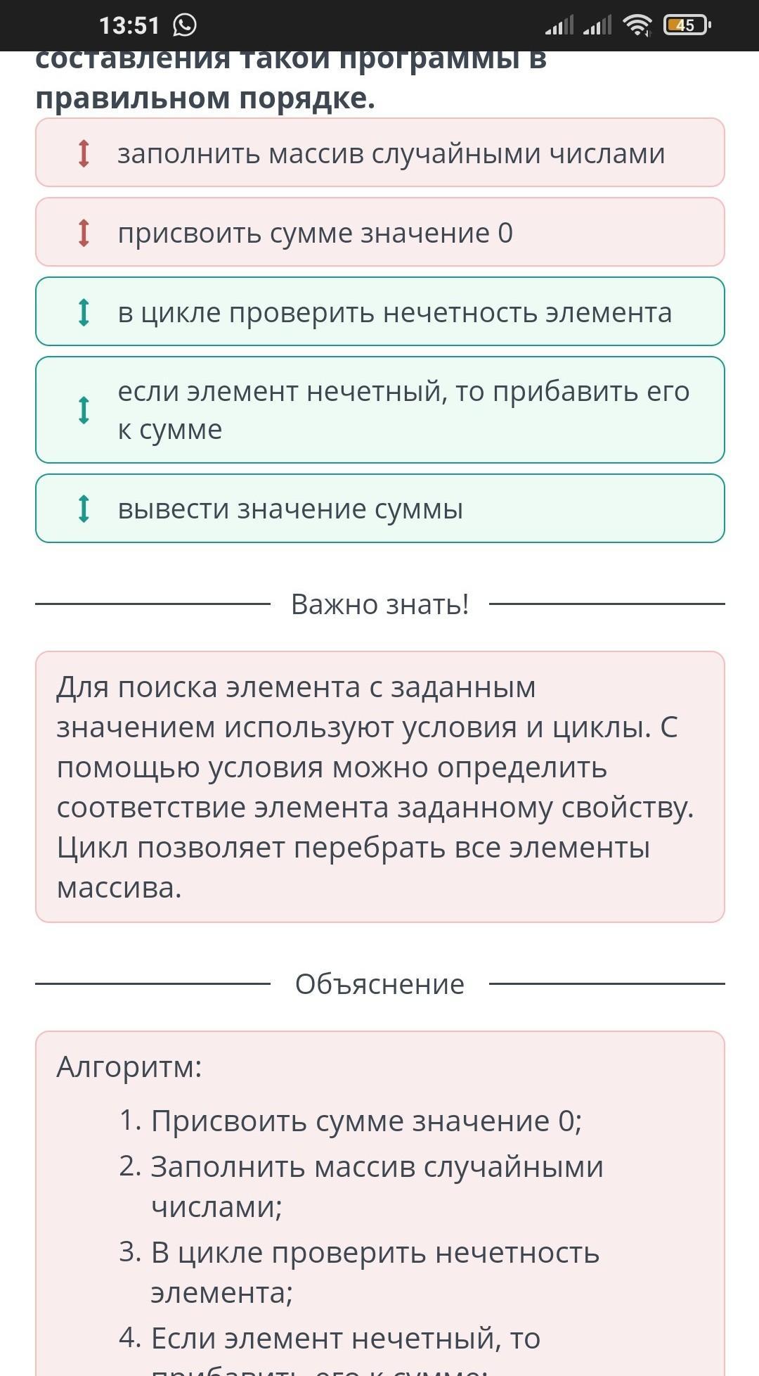 Дан массив из 15 случайных чисел. Требуется определить сумму нечетных элементов. Расположи команды алгоритма для составления такой программы в правильном порядке. 1 если элемент нечетный, то прибавить его к сумме І заполнить массив случайными числами Вывести значение суммы І присвоить сумме значение о І в цикле проверить нечетность элемента