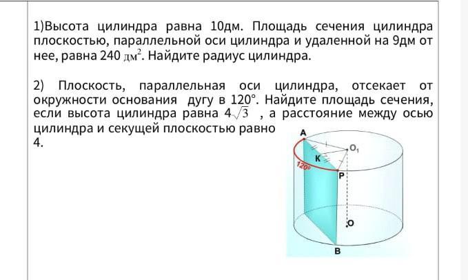 2) Дан цилиндр , H=OO₁=PB= , O₁K=4 (аналогично предыдущей задаче) , дуга АР=120° .