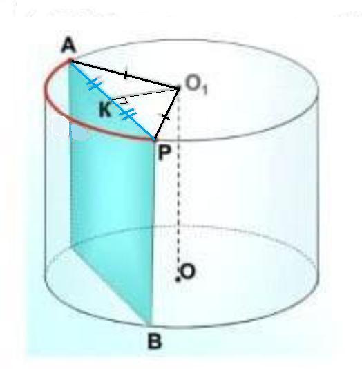 Расстояние между прямой и параллельной ей плоскостью – это расстояние (длина перпендикуляра) от любой точки заданной прямой до заданной плоскости. По условию сечение параллельно оси цилиндра, поэтому расстоянием от оси до сечения будет отрезок O₁К , который перпендикулярен сечению, O₁К⊥АР .