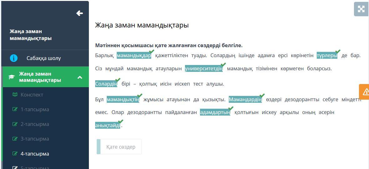 Жаңа заман мамандықтары Мәтіннен қосымшасы қате жалғанған сөздерді белгіле. Барлық мамандыкдар қажеттіліктен туады. Солардың ішінде адамға ерсі көрінетін түрлеры де бар. Сіз мұндай мамандық атауларын университетдің мамандық тізімінен көрмеген боларсыз. Солардің бірі – қолтық иісін иіскеп тест алушы. Бұл мамандықтің жұмысы атауынан да қызықты. Мамандардың өздері дезодорантты себуге міндетті емес. Олар дезодоран пайдаланған адамдартың қолтығын иіскеу арқылы оның әсерін анықтайді. Кате сезлер ПОМОГИТЕ!!!!