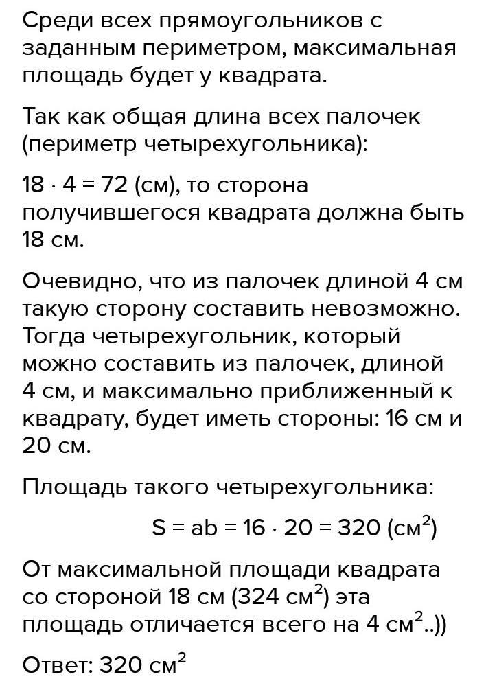 математика алдамуратова номер 806 6 класс срочно пожалуйста Задача: из 18 палочек с одинаковой длиной по 4 см сложили прямоугольник наибольшей площади. Найдите площадь этого прямоугольника.