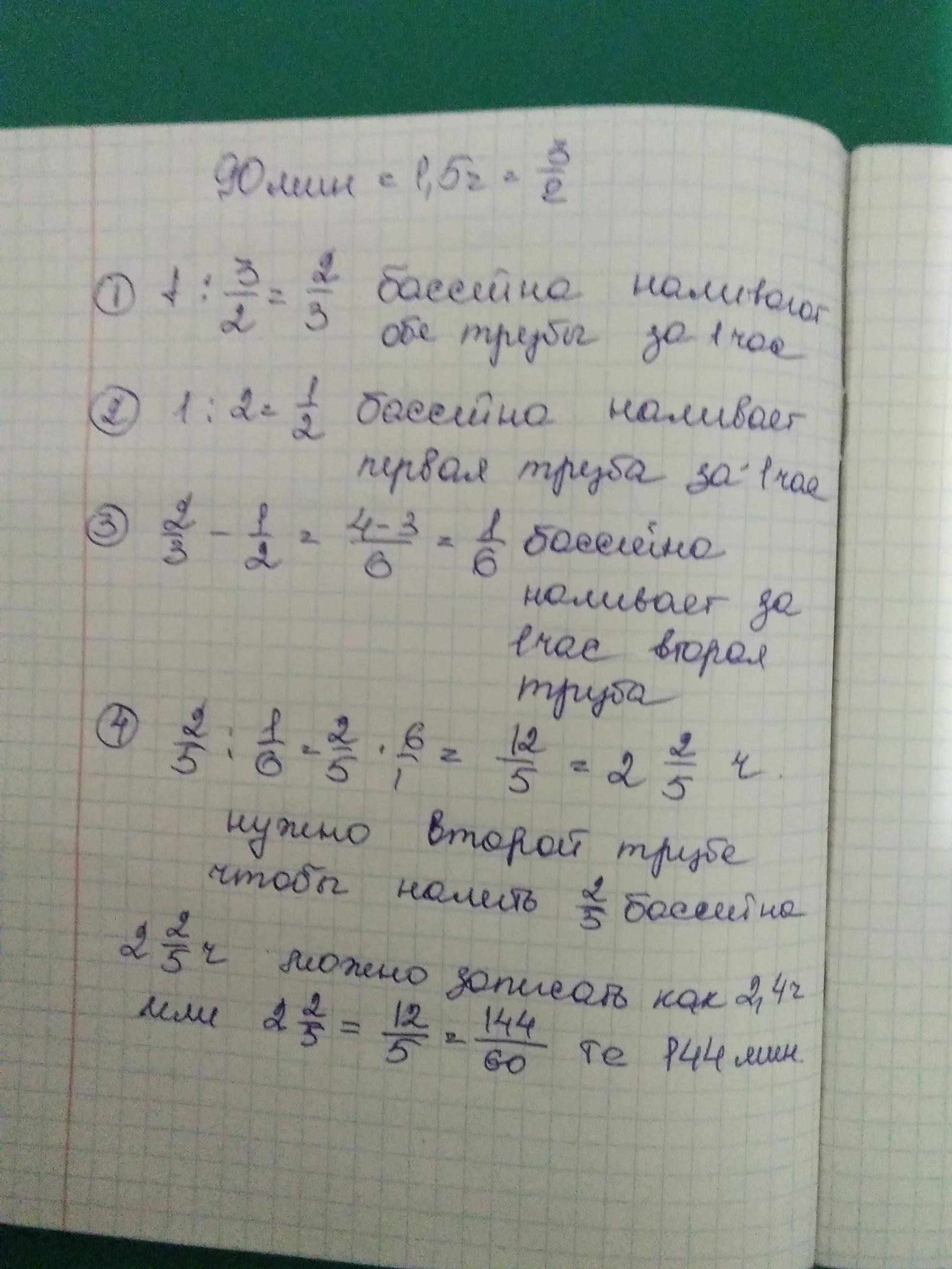 Один бассейн наполняется двумя трубами вместе за 90 минут. Когда первая труба течет одна, бассейн наполняется за 2 часа, вторая труба наполняет бассейн ⅖ Сколько времени занимает заполнение раздела?