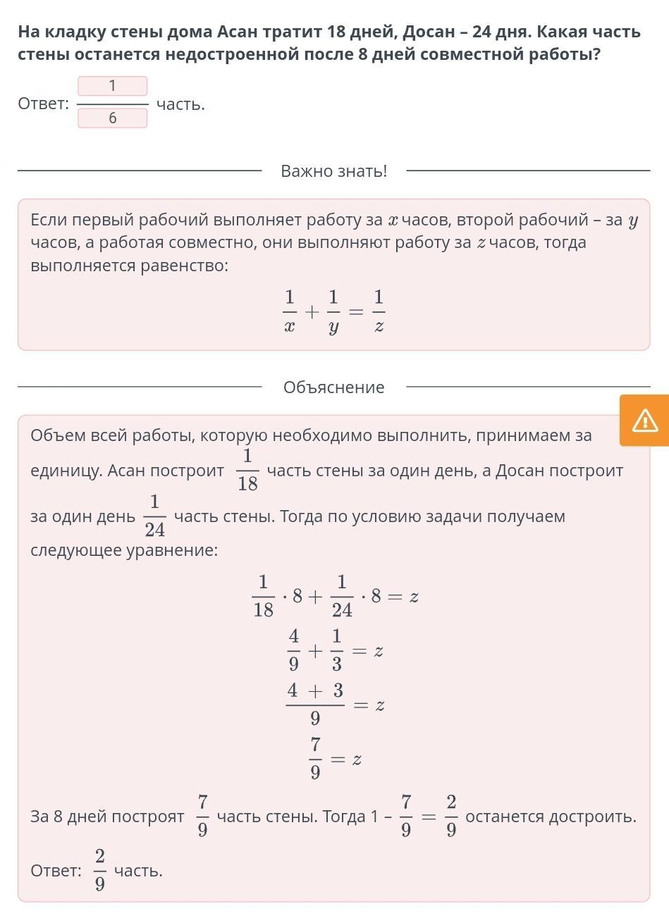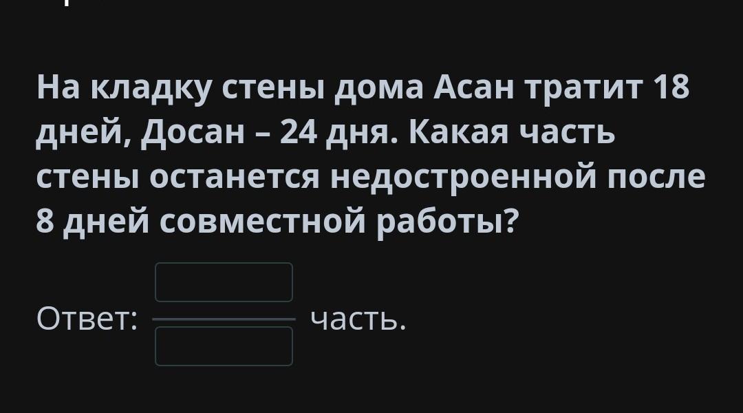 кладку стены дома Асан тратит 18 дней, Досан – 24 дня. Какая часть стены останется недостроенной после 8 дней совместной работы?, ПОМОГИТЕ ПОЖАЛУЙСТА УМОЛЯЮ ВАС ДАМ 30 БАЛЛОВ