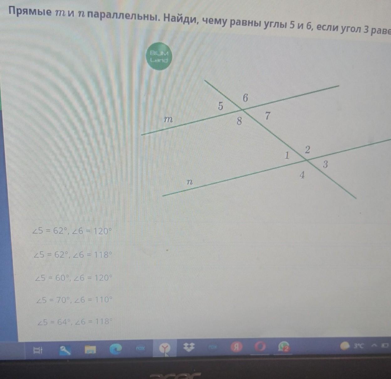Ответ: 1) углы 5 и 7 и 1 и 3 равны 62 градуса, а углы 6 и 8 и 2 и 4 равны 118 градусов.