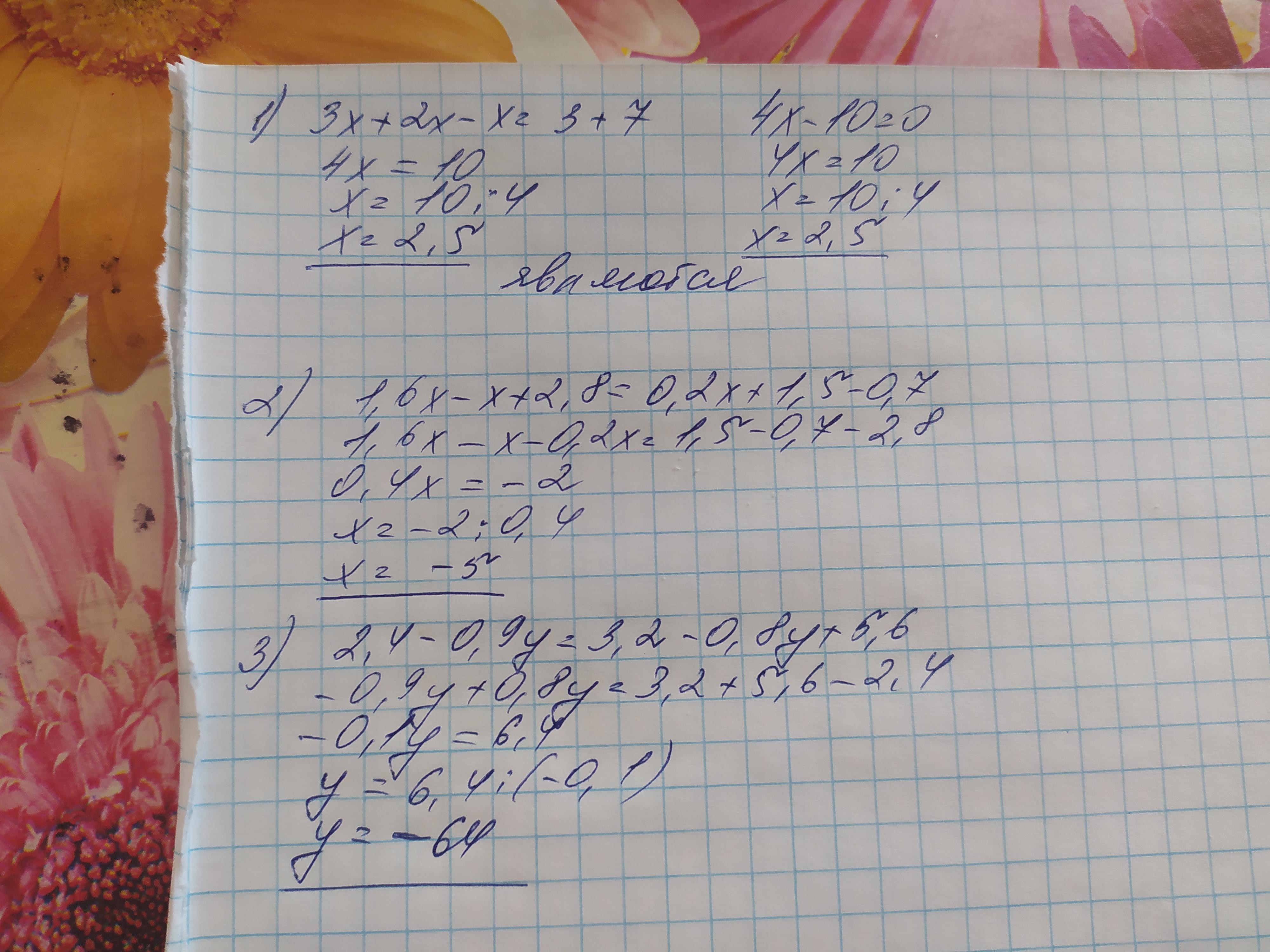 (формативное оценивание «Линейное уравнение с одной переменной. Равносильные уравнения» Вариант 1 Задание 1. Определите, являются ли данные уравнения равносильными уравнениями: 1) 3х - 7 + 2х - 3 = x; 2) 4x - 10 ). Задание 2. Найдите корень уравнения: 1) 1,бх - (х - 2,8) - (0,2 + 1,5) - 0,7. Задание 3. Решите уравнение: 1) 0,3(8 — 3y) = 3,2 - 0,8(у -- 7).