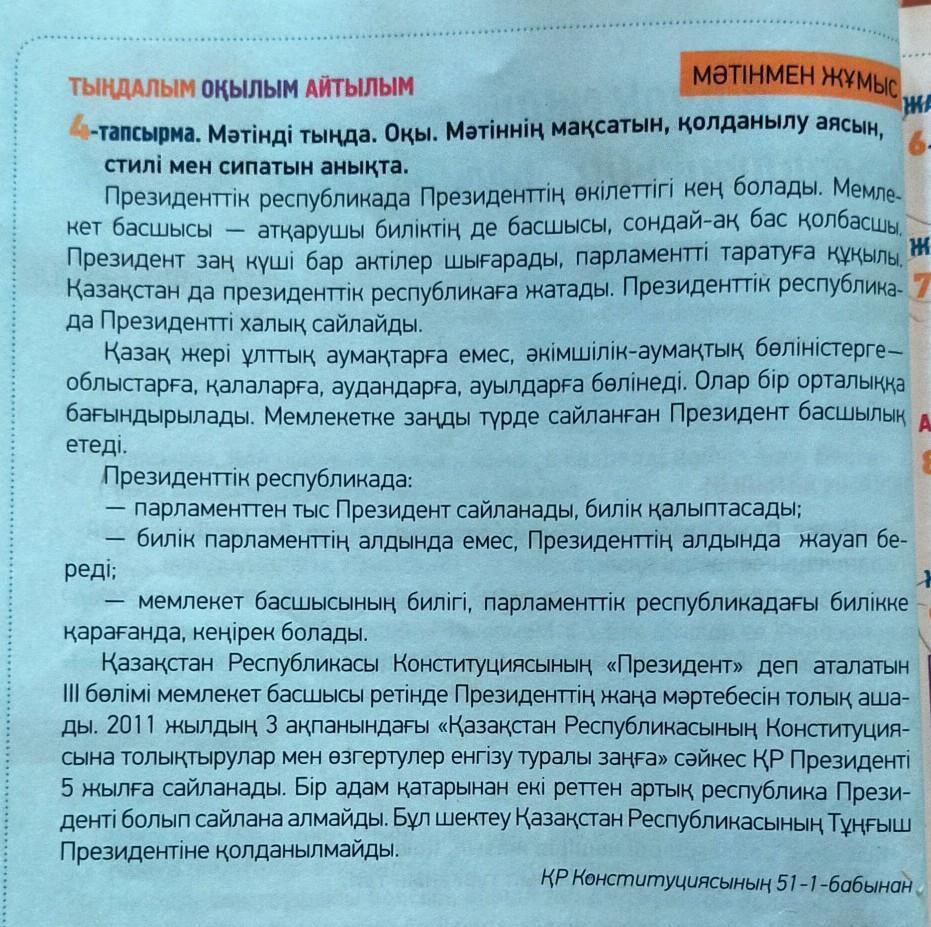 6-тапсырма. Мәтіннен публицистикалық стильде жазылған бөлікті тауып, көшіріп жаз. президенттік республикада