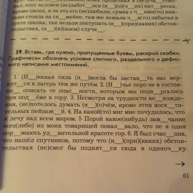 никакая, не могла,заставить,вернуться.2)ничье ,состоянии,опасности,подвергались,подъеме,не хотелось, ни о чем,восхитительных,пейзажей. 4) на какой-то. 5) какое-нибудь ,кого-либо. 6)счастлив, не при каких , не смог,подняться,одиночку.