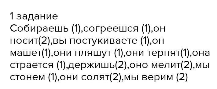 Собира_ш_ ( спр.), согре_ш_ся ( спр.), он нос_т ( спр.), вы постукива_т_ ( спр.), он маш_т ( спр.), они пляш_т ( спр._), они терп_т ( спр.), она стара_тся ( спр.), держ_ш_ ( спр.), пил_ш_ (спр.), оно мел_т ( спр.), мы стон_м ( спр.), они сол_т ( спр.), мы вер_м ( спр.).