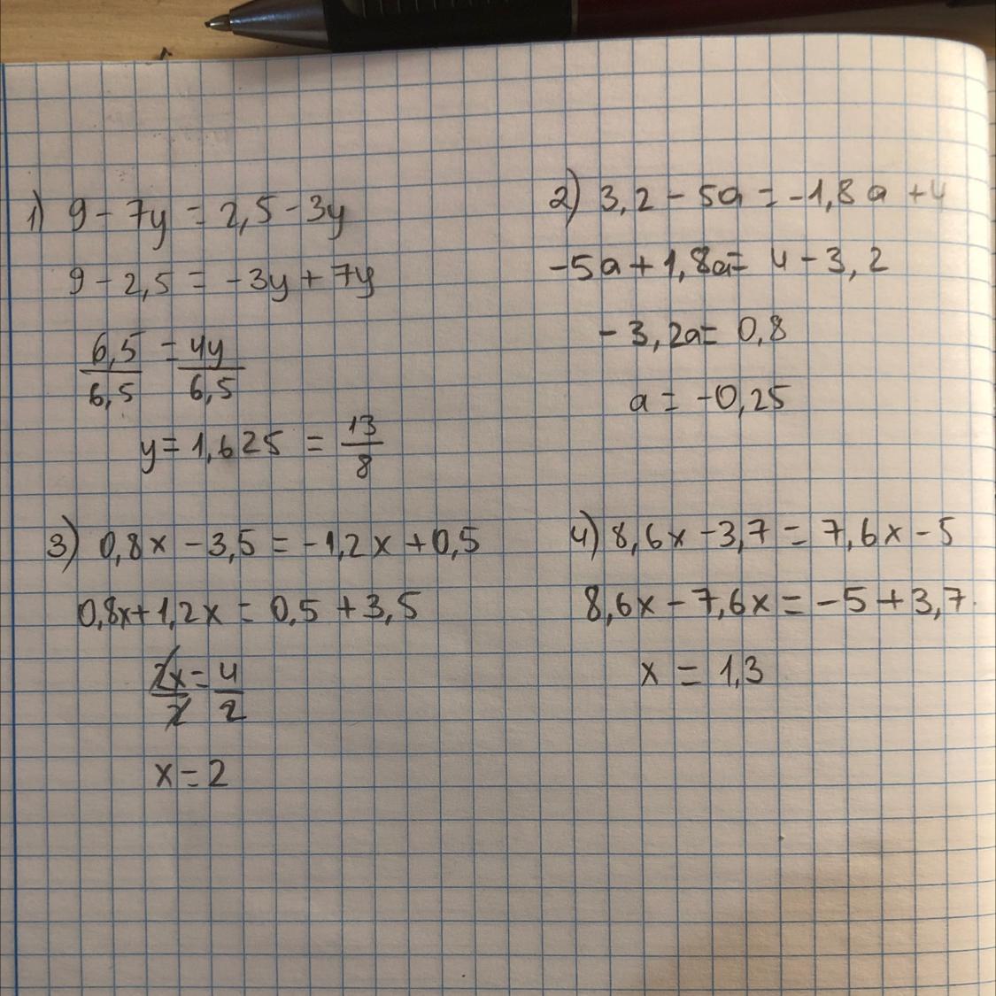 816. 1) 9 - 7y - 2.5 - 3v; - 2) 3.2 - 5a = -1.8 a + 4: 3) 0.8 x - 3.5 = -1.2 x + 0.5: 4) 8.6 x - 3,7 4) 8.6 x - 3,7 = 7.6 r - 5.