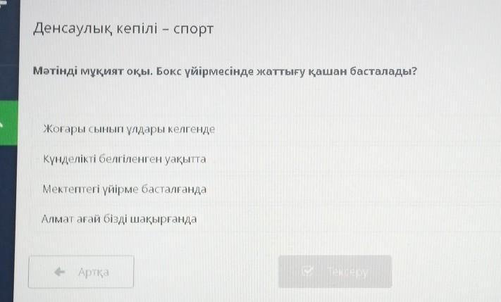 Денсаулық кепілі – спорт Мәтінді мұқият оқы. Бокс үйірмесінде жаттығу қашан басталады? Marin Жоғары сынып ұлдары келгенде Күнделікті белгіленген уақытта Мектептегі үйірме басталғанда Алмат ағай бізді шақырғанда Артқа Тексеру