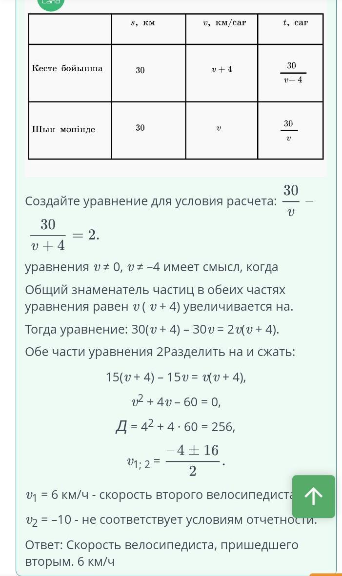Два велосипедиста одновременно отправляются в 30-километровый заезд по национальному природному парку Бурабай. Первый едет со средней скоростью на 4 км/ч большей, чем второй, и прибывает к финишу на 2 ч раньше второго. Найди скорость велосипедиста, пришедшего к финишу вторым. ответ?