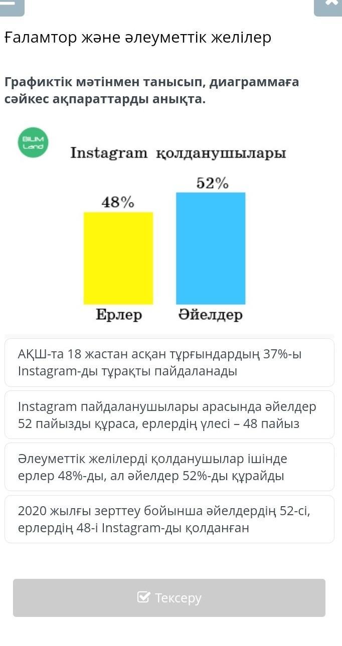 Инстаграм пайдаланушылары арасында әйелдер 52 пайызды құраса, ерлердің үлесі 48 пайыз