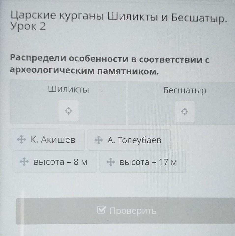 Распредели особенности в соответствии с археологическим памятником. Шиликты Бесшатыр К. Акишев ТА. Толеубаев Высота — 8 м высота - 17 м