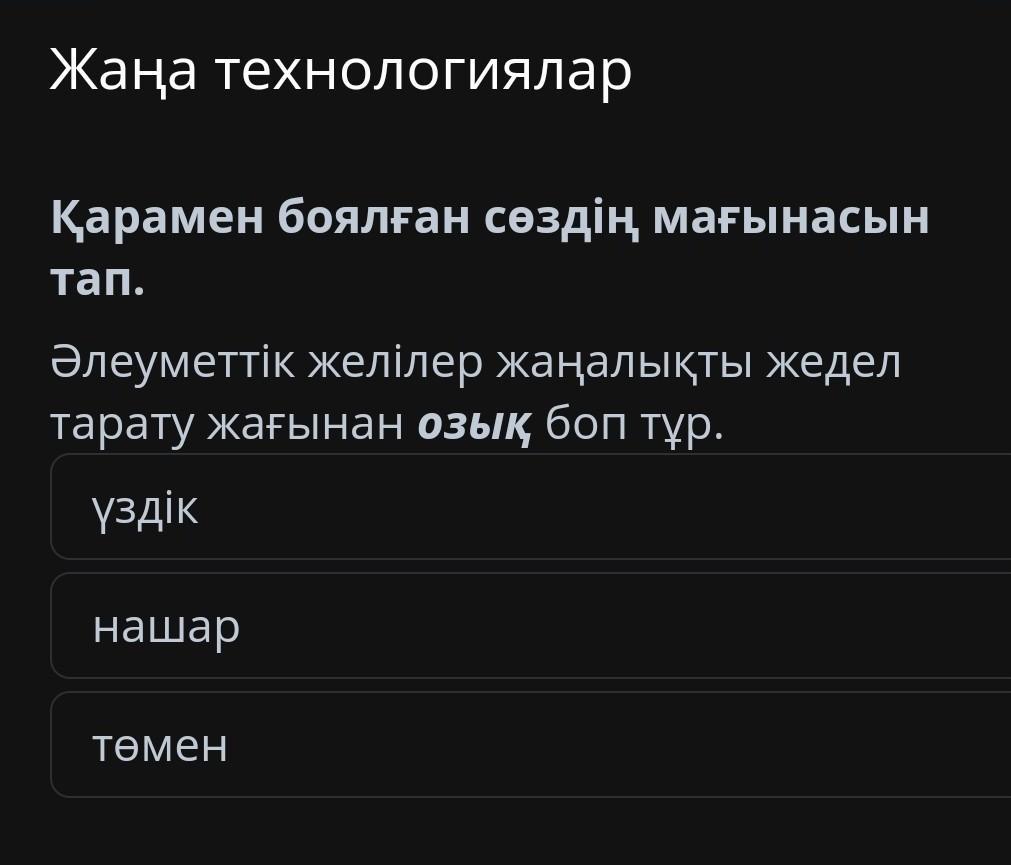 a технологиялар Қарамен боялған сөздің мағынасын тап. Әлеуметтік желілер жаңалықты жедел тарату жағынан озық боп тұр. үздік төмен нашар