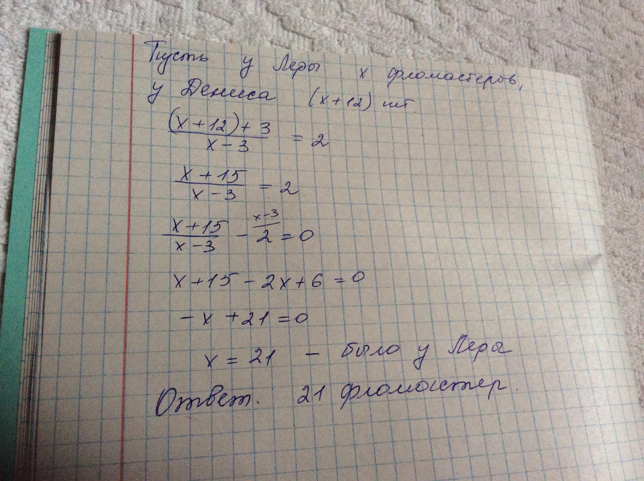 Реши задачу У Леры было на 12 фломастеров меньше, чем у Дениса. Когда Лера отдала з фломастера Денису, у него стало в 2 раза больше фломастеров, чем у Леры. Сколько фломастеров было у Леры сначала?