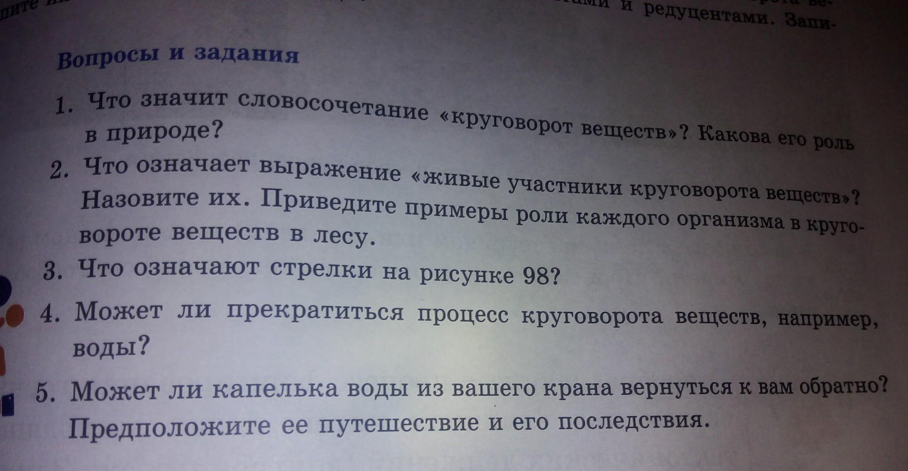 Вопросы и задания 1. Что значит словосочетание «круговорот веществ»? Какова его роль в природе? 2. Что означает выражение «живые участники круговорота веществ»? Назовите их. Приведите примеры роли каждого организма в круго- вороте веществ в лесу. 3. Что означают стрелки на рисунке 98? 4. Может ли прекратиться процесс круговорота веществ, например, воды? 5. Может ли капелька воды из вашего крана вернуться к вам обратно? Предположите ее путешествие и его последствия.