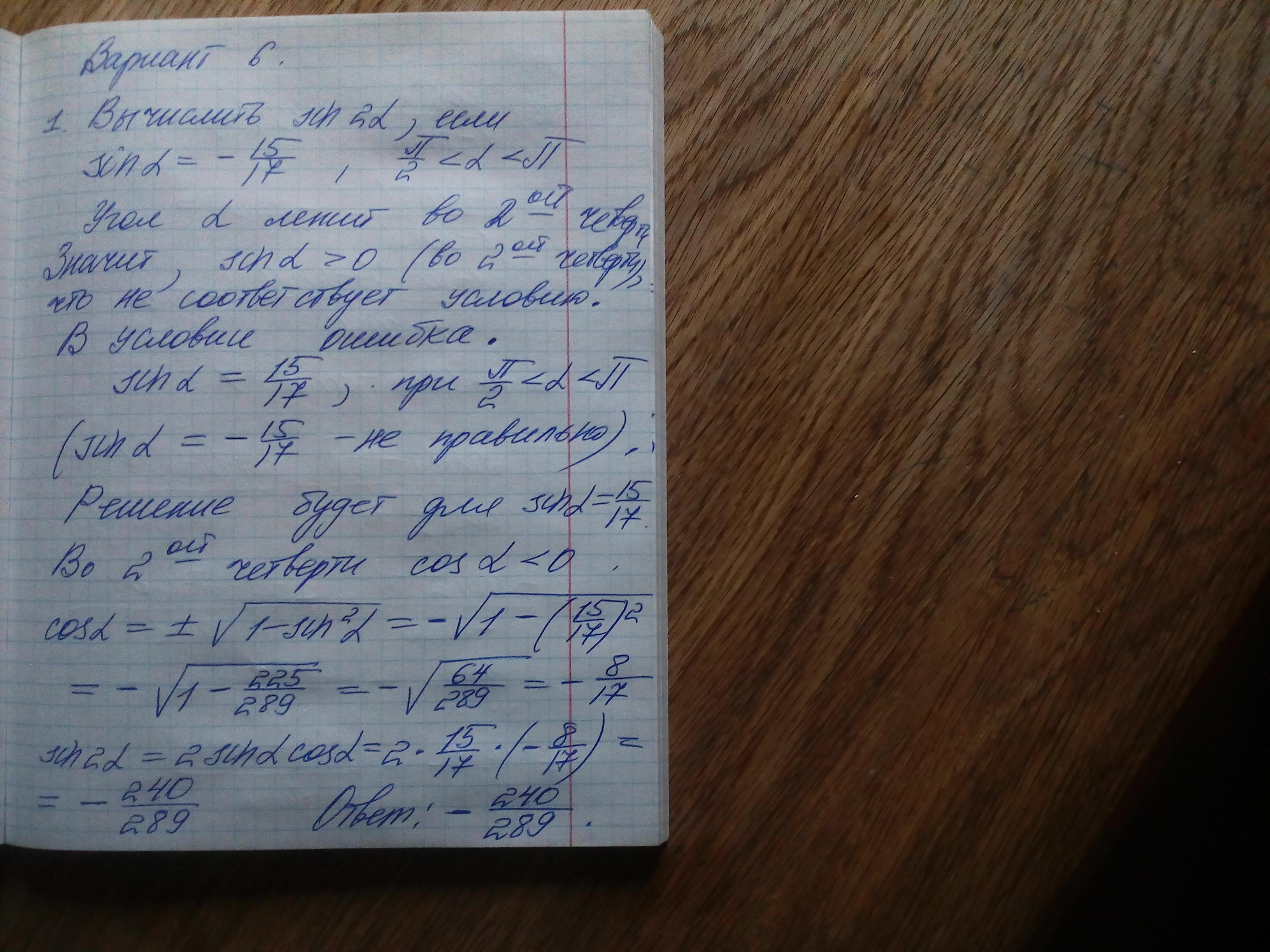 1) Вычислить sin2a, если sina=-15/17